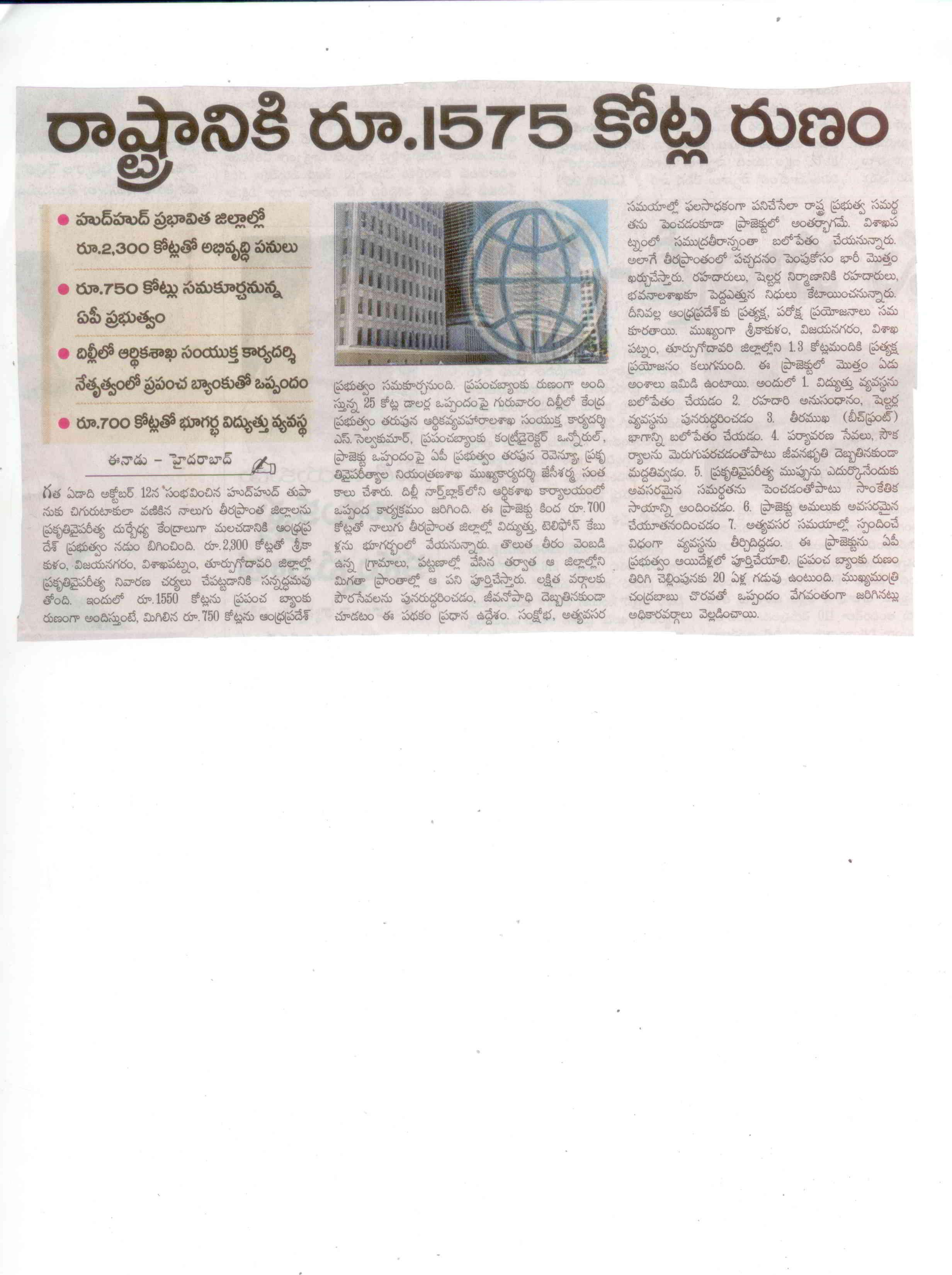 A.P. signs Rs.1587cr credit agreement with World Bank - -EENADU